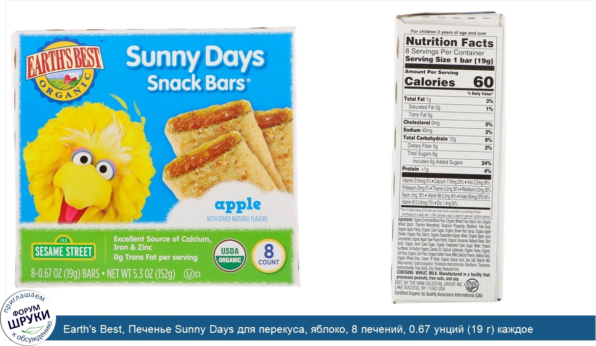 [DESCRIPT]With Other Natural Flavors. Excellent Source of Calcium, Iron Zinc. 0 g Trans Fat per Serving. USDA Organic. Kosher. For Children 2 Years of Age and Over. Certified Organic by QAI. The Earth's Best Way To Grow. Made with real apples. Excellent source of calcium, iron zinc. Made with no genetically modified ingredients. No hydrogenated oils- 0 g trans fat per serving. No artificial colors or flavors. Sunny Days Snack Bars Ready.Set.Snack! Earth's Best Organic Apple Sunny Days Snack Bars. are made with delicious apples enclosed in a wholesome wheat, oat and corn flour crust. Our bars are the perfect size for toddlers' small hands and soft enough for even the most delicate of mouths. These individually wrapped bars are sure to be a hit at home and on the go! Play a fun game with words: Apple starts with the letter "A". What other words start with "A"? Did you know that one serving of Sunny Days is an excellent source of iron.[/DESCRIPT]... (описание дополняется)