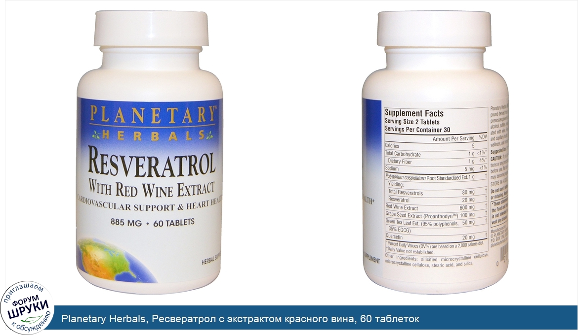Друзья, если у вас есть отзыв/дополнение/комментарий/вопрос относительно Planetary Herbals, Ресвератрол с экстрактом красного вина, 60 таблеток - напишите его ответом в эту тему (это будет полезно всему сообществу в целом и вам в отдельности).