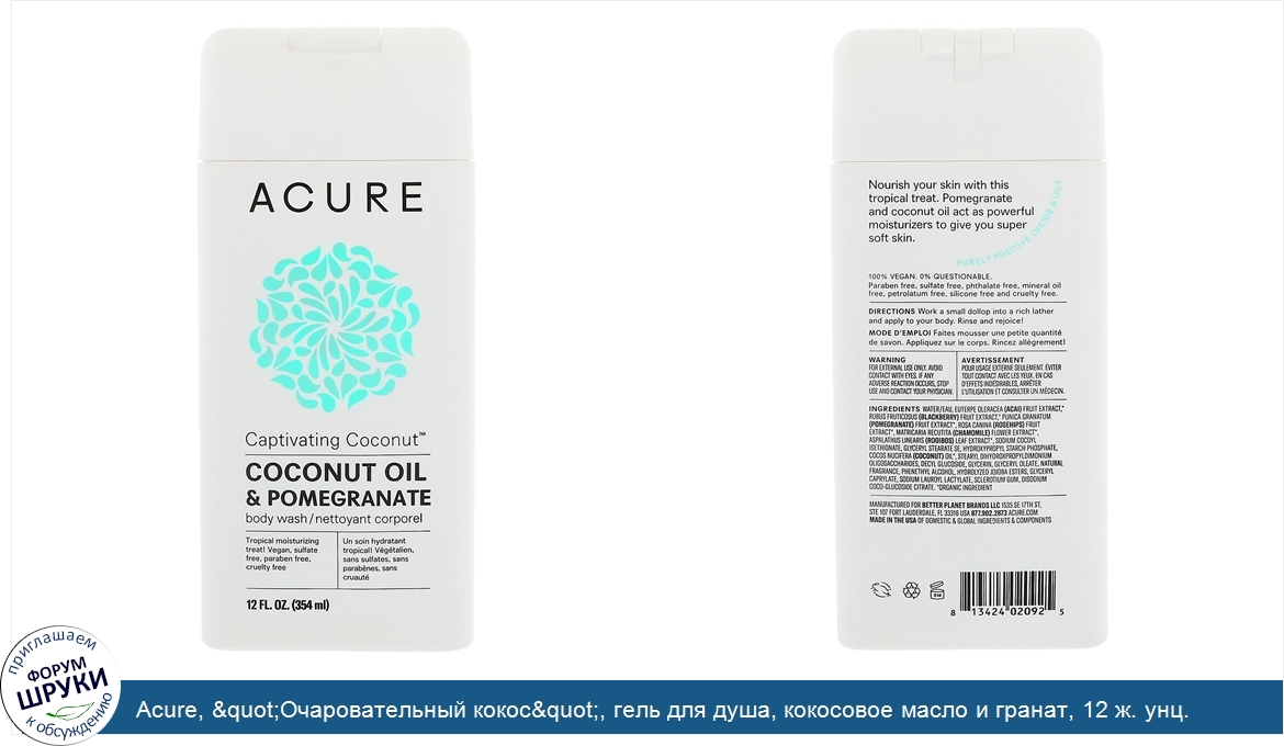 Друзья, если у вас есть отзыв/дополнение/комментарий/вопрос относительно Acure, "Очаровательный кокос", гель для душа, кокосовое масло и гранат, 12 ж. унц. (354 мл) - напишите его ответом в эту тему (это будет полезно всему сообществу в целом и вам в отдельности).