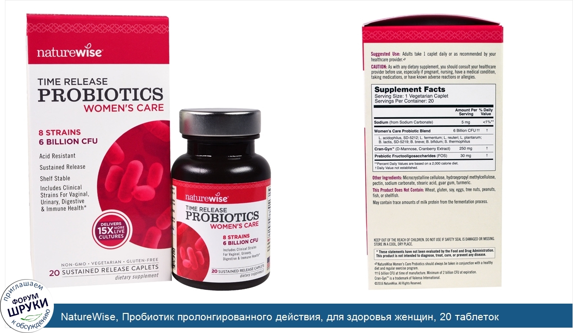 [DESCRIPT]8 Strains. 6 Billion CFU. Acid Resistant. Sustained Release. Shelf Stable. Includes Clinical Strains for Vaginal, Urinary, Digestive Immune Health. Delivers 15x More Live Cultures. Non-GMO. Vegetarian. Gluten-Free. Dietary Supplement. Live Healthy. Live Happy. Gastric Acid Protection. Heightened Potency. GMP Certified - Good Manufacturing Practice. At NatureWise we believe that when you increase health happiness in the world, it benefits everyone. From our products and customer support to the way we give back, it's all part of our mission to help people live healthier, happier lives. Women's Care Probiotics. With Clinical Strains For Women's Health. Beneficial microflora are plentiful in a woman's urinary tract and vagina. But, if that delicate balance is off, it's easy for opportunistic species of yeast and bacteria to overpopulate, leading to issues like UTIs, yeast infections, and urinary discomfort. Carefully formulated with clinically proven strains and select prebiotics. NatureWise Women's Care Probiotics includes cranberry with D-Mannose for enhanced urinary tract support. Just one caplet daily promotes optimal vaginal, digestive, and immune health for women. WiseBiotics Delivery System. Stomach acids can destroy up to 96% of probiotics before they ever reach the lower GI tract. Our WiseBiotics delivery system ensures not only that your probiotic caplet survives transit through corrosive gastric acids, but will continue to deliver a controlled release of live, active cultures over an extended period of time, throughout your large and small intestines, for optimal health. With its unique sustained-release caplet technology, our WiseBiotics delivery system works smarter than standard probiotic capsules or softgels to protect and deliver 15 times more live cultures to their targeted destination.[/DESCRIPT]... (описание дополняется)