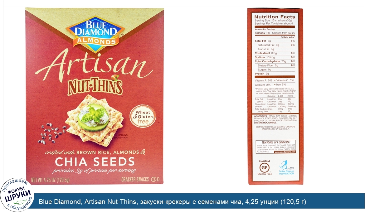 [DESCRIPT]Wheat Gluten Free. Crafted With Brown Rice and Almonds. Provides 3 g of Protein Per Serving. Certified Gluten-Free. The Delicious Gluten-Free Artisan Cracker. We think you'll agree these artisan-baked crackers go well with almost everything. Now you can enjoy the delicious taste of Blue Diamond Artisan Nut-Thins with the added tasty benefits of Chia Seeds. We're sure they'll be your new favorite, guilt-free snack! Tasty Benefits per Serving. 3 g of Protein. 135 mg of ALA Omega-3. 130 Calories for 13 Crackers. No Wheat or Gluten.[/DESCRIPT]... (описание дополняется)