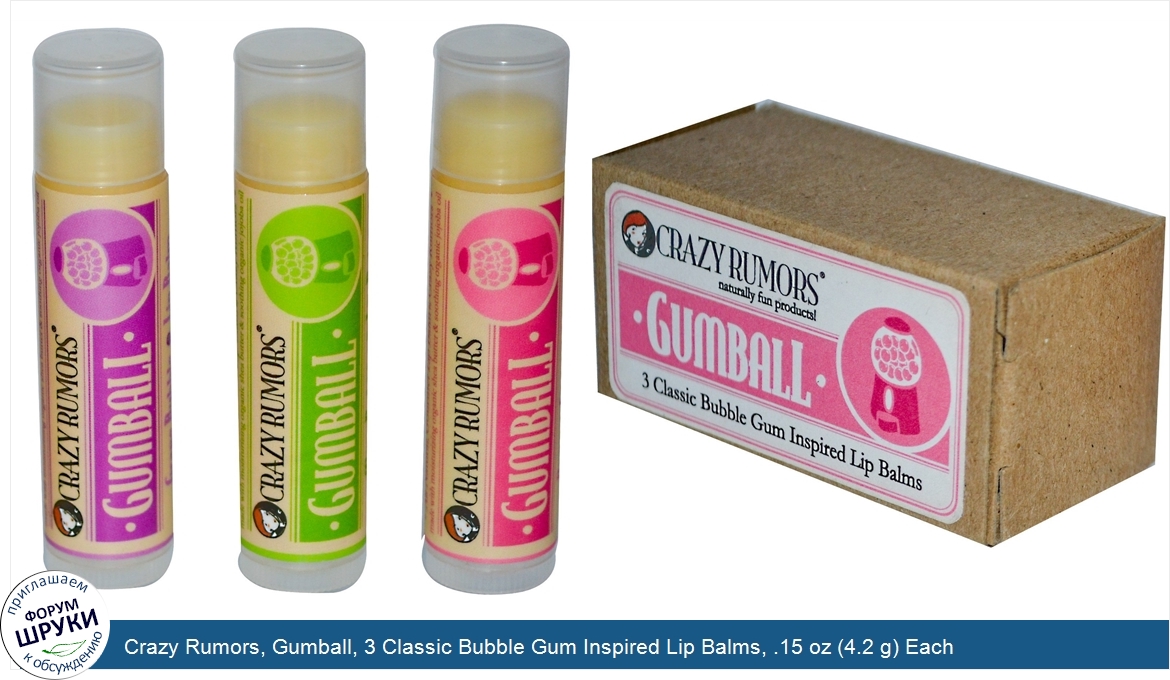 ru Crazy Rumors, Gumball, 3 Classic Bubble Gum Inspired Lip Balms, .15 oz (4.2 g) Each