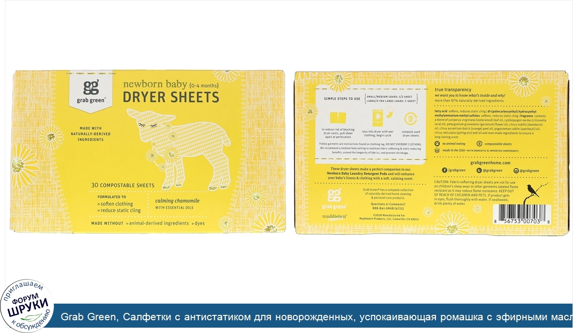 Друзья, если у вас есть отзыв/дополнение/комментарий/вопрос относительно Grab Green, Салфетки с антистатиком для новорожденных, успокаивающая ромашка с эфирными маслами, 0-4 месяцев, 30 биоразлагаемых салфеток - напишите его ответом в эту тему (это будет полезно всему сообществу в целом и вам в отдельности).