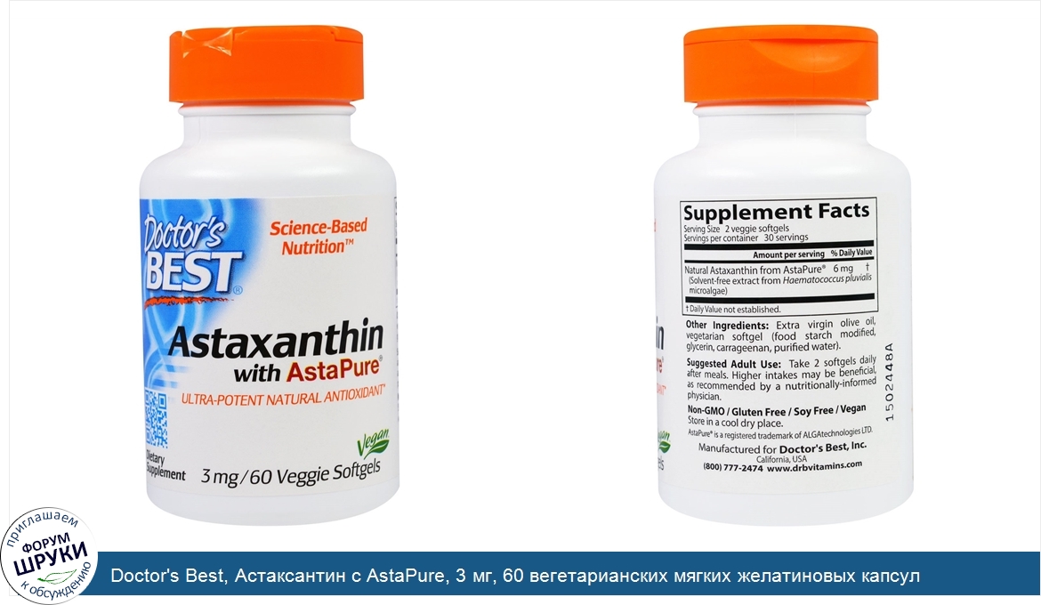 Друзья, если у вас есть отзыв/дополнение/комментарий/вопрос относительно Doctor's Best, Астаксантин с AstaPure, 3 мг, 60 вегетарианских мягких желатиновых капсул - напишите его ответом в эту тему (это будет полезно всему сообществу в целом и вам в отдельности).