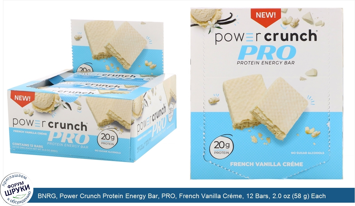 Друзья, если у вас есть отзыв/дополнение/комментарий/вопрос относительно BNRG, Power Crunch Protein Energy Bar, PRO, French Vanilla Créme, 12 Bars, 2.0 oz (58 g) Each - напишите его ответом в эту тему (это будет полезно всему сообществу в целом и вам в отдельности).
