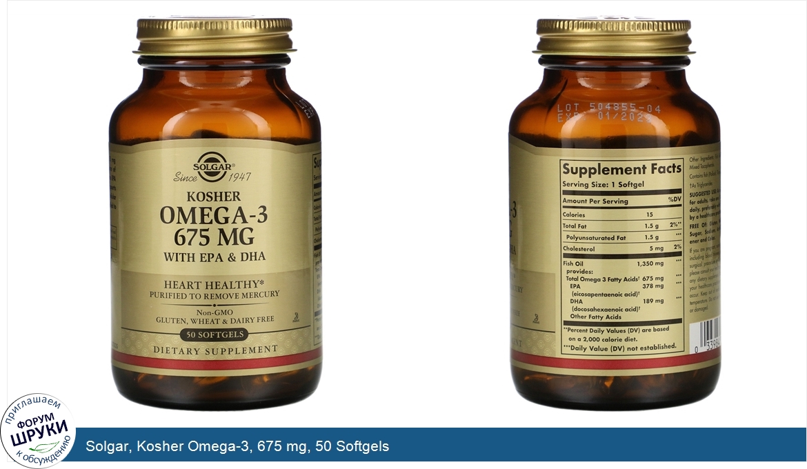 [DESCRIPT]Since 1947. With EPA DHA. Heart Healthy. Purified to Remove Mercury. Non-GMO. Gluten, Wheat Dairy Free. K-Parve. Dietary Supplement. Solgar® Kosher Omega-3 675 mg provides a concentrated source of the Omega 3 polyunsaturated EPA and DHA. This formulation supports cardiovascular, joint and cellular health. It is molecularly distilled to remove mercury.[/DESCRIPT]... (описание дополняется)