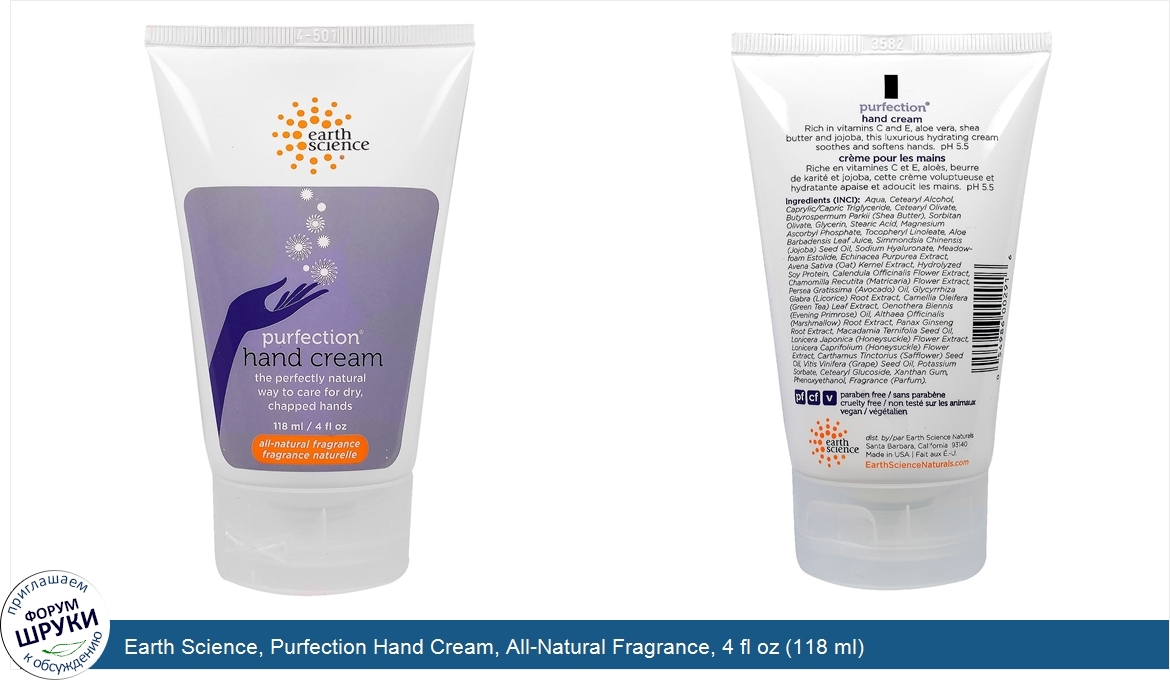 Earth Science, Purfection Hand Cream, All-Natural Fragrance, 4 fl oz (118 ml)