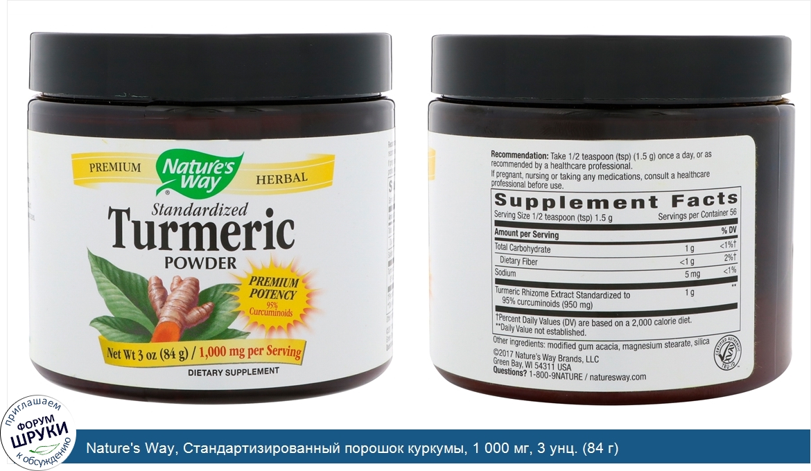 Друзья, если у вас есть отзыв/дополнение/комментарий/вопрос относительно Nature's Way, Стандартизированный порошок куркумы, 1 000 мг, 3 унц. (84 г) - напишите его ответом в эту тему (это будет полезно всему сообществу в целом и вам в отдельности).