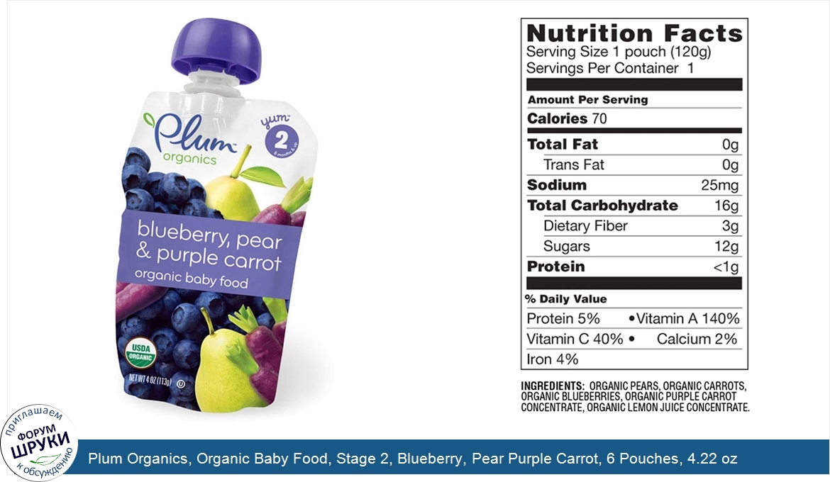 Друзья, если у вас есть отзыв/дополнение/комментарий/вопрос относительно Plum Organics, Organic Baby Food, Stage 2, Blueberry, Pear Purple Carrot, 6 Pouches, 4.22 oz (120 g) Each - напишите его ответом в эту тему (это будет полезно всему сообществу в целом и вам в отдельности).