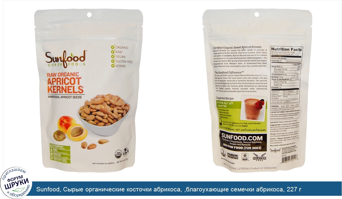 Друзья, если у вас есть отзыв/дополнение/комментарий/вопрос относительно Sunfood, Сырые органические косточки абрикоса, ,благоухающие семечки абрикоса, 227 г - напишите его ответом в эту тему (это будет полезно всему сообществу в целом и вам в отдельности).