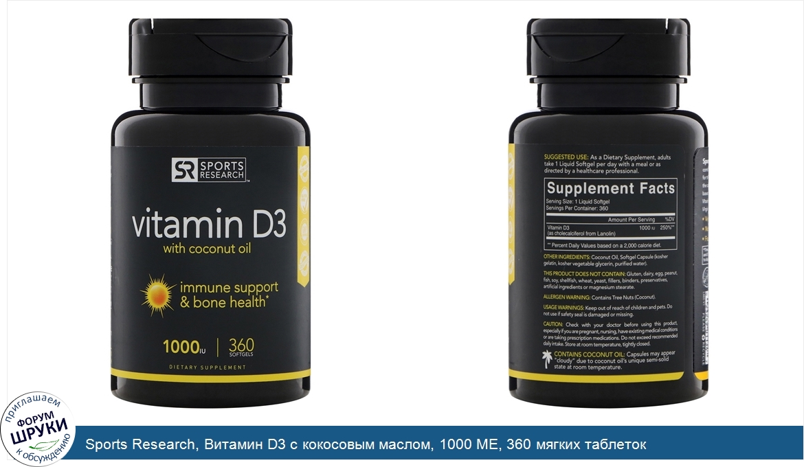 [DESCRIPT]Immune Support Bone Health. Dietary Supplement. Made with Non GMO Ingredients. Gluten Free. GMP Certified - Good Manufacturing Practice. 3rd Party Certified Tested. Sports Research Vitamin D3 with coconut oil delivers the same biologically active form of Vitamin D produced in the body as a result of direct sunlight without the risk of unprotected UVB exposure. Daily intake of Vitamin D3 is essential for calcium absorption and maintaining strong bones and teeth. Enhances calcium absorption. Non-GMO Gluten Free. Formulated With Coconut Oil.[/DESCRIPT]... (описание дополняется)