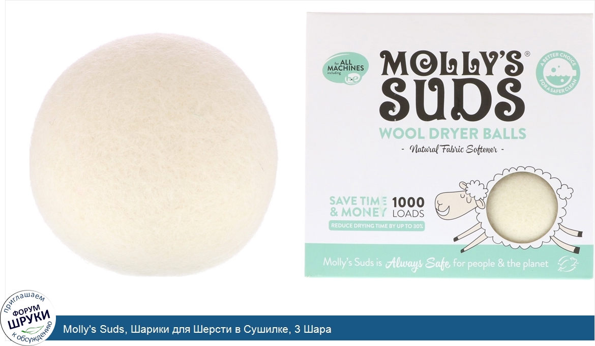 [DESCRIPT]Мы хотим, чтобы ваша одежда стала мягче. Для все машин, включая HE. Лучший выбор для безопасной стирки. Натуральный смягчитель ткани. 1000 загрузок. Экономия времени и денег. Снижает время сушки до 30%. Molly's Suds — продукт, безопасный для людей и для планеты. Естественное смягчение постельных принадлежностей. Не содержит красящие вещества и отдушки. Биологически разлагаемый продукт с антибактериальными свойствами, который можно отправлять в компост. Белье меньше мнется. Сваленные вручную шерстяные шарики для сушки. Наша 100% небеленая шерсть без ароматизаторов используется для изготовления шерстяных шариков, сертифицированных как продукт, который не был тестирован на животных. Шарики сваливаются вручную женщинами из Непала, поддерживающими своим доходом семью. Шерсть состригается вручную на семейных фермах в Новой Зеландии. Наша компания была основана няней и мамой в 2008 году, которых вдохновила на это потеря дочери Молли. От нашей семьи вашей. Благодарим за выбор Molly's Suds.[/DESCRIPT]... (описание дополняется)