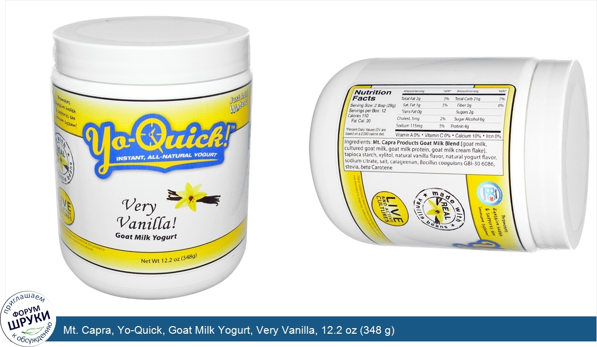 Друзья, если у вас есть отзыв/дополнение/комментарий/вопрос относительно Mt. Capra, Yo-Quick, Goat Milk Yogurt, Very Vanilla, 12.2 oz (348 g) - напишите его ответом в эту тему (это будет полезно всему сообществу в целом и вам в отдельности).