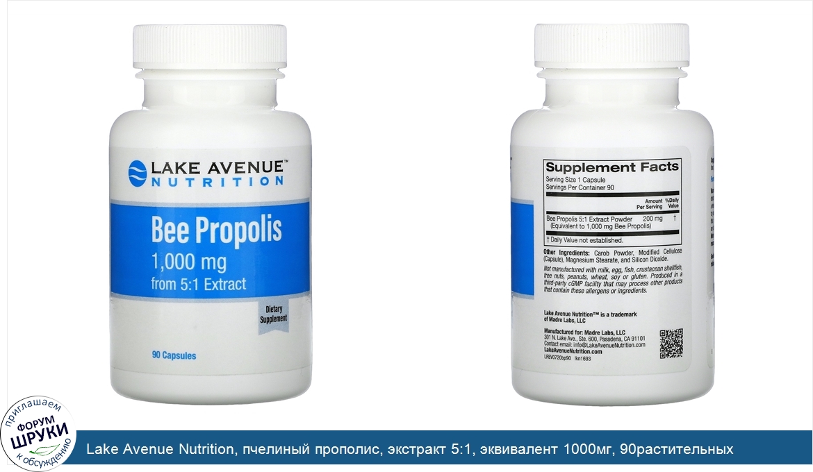 Lake Avenue Nutrition, пчелиный прополис, экстракт 5:1, эквивалент 1000мг, 90растительных капсул