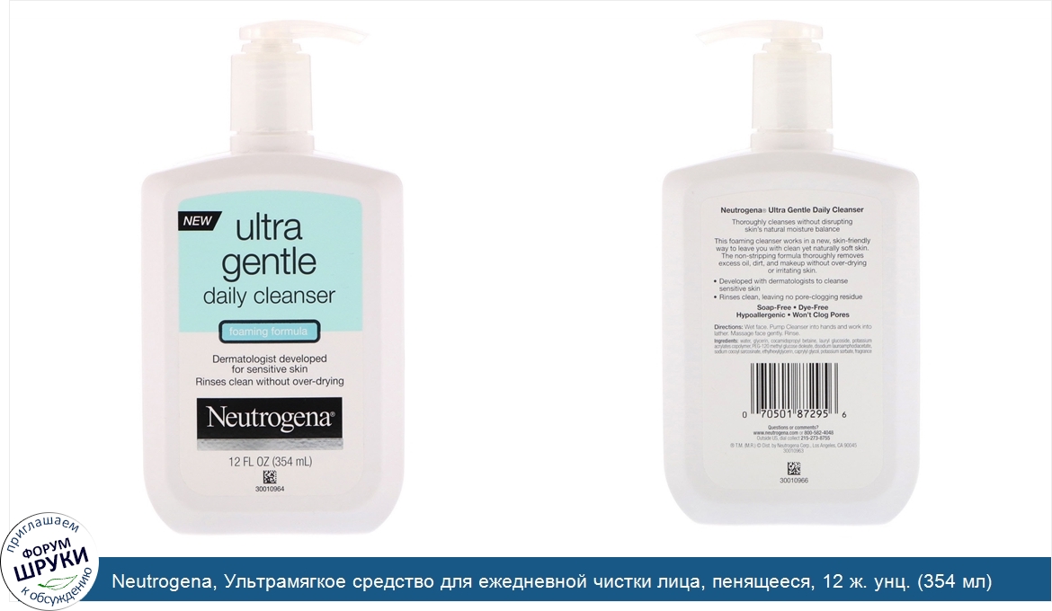 [DESCRIPT]Dermatologist Developed for Sensitive Skin. Rinses Clean without Over-Drying. Soap-Free. Dye-Free. Hypoallergenic. Won't Clog Pores. Neutrogena Ultra Gentle Daily Cleanser thoroughly cleanses without disrupting skin's natural moisture balance. This foaming cleanser works in a new, skin-friendly way to leave you with clean yet naturally soft skin. The non-stripping formula thoroughly removes excess oil, dirt, and makeup without over-drying or irritating skin. Developed with dermatologists to cleanse sensitive skin. Rinses clean, leaving no pore-clogging residue.[/DESCRIPT]... (описание дополняется)