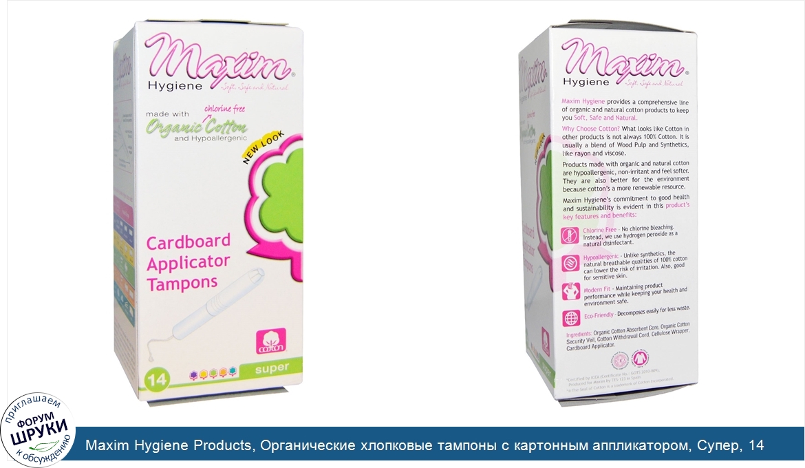 Друзья, если у вас есть отзыв/дополнение/комментарий/вопрос относительно Maxim Hygiene Products, Органические хлопковые тампоны с картонным аппликатором, Супер, 14 тампонов - напишите его ответом в эту тему (это будет полезно всему сообществу в целом и вам в отдельности).