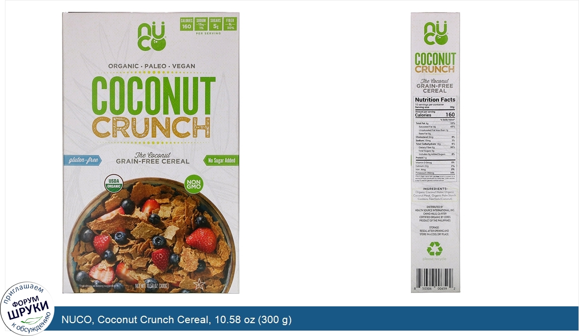 [DESCRIPT]Calories 160, Sodium -15 mg- 1%, Sugar 5 g, Fiber -8g- 30% /Per Serving. Paleo. Vegan. Gluten-Free. The Coconut Grain-Free Cereal. No Sugar Added. USDA Organic. Non GMO. Kosher. Certified Organic by Ceres. 100% Satisfying 100% Delicious. Grain-Free. Our Mission. Giving back to Filipino farmers and their communities, while also supporting health and wellness by giving back to our bodies. What Is NUCO Coconut Crunch? This crunchy, grain-free cereal is made with three simple, sustainably sourced ingredients: coconut meat, coconut water and palm starch. Coconuts are a super-food packed with medium-chain-triglycerides (MCTs). Each satisfying bite is tasty and naturally sweet! Only 3 Ingredients:. Organic Coconut Water. Organic Coconut Meat. Organic Palm Starch. That's it! Where It Begins. Producing delicious, all-natural products starts by using the best ingredients. At NUCO, we create supportive partnerships with coconut farmers in the Philippines who nuture and pluck the best organically grown coconuts from their groves. These coconuts are the foundation of the products we create, and it is our mission to improve farmers' lives, transform their communities, preserve the environment, and bring the best coconut-based products to you and your family.[/DESCRIPT]... (описание дополняется)