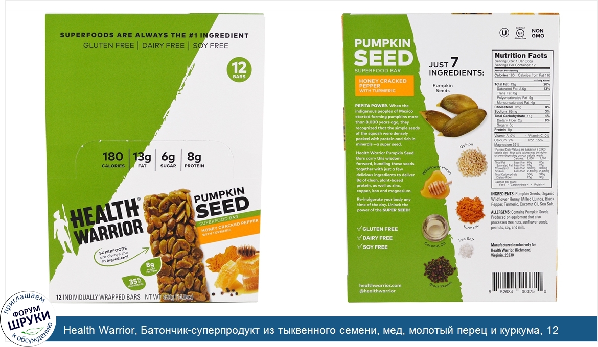 Друзья, если у вас есть отзыв/дополнение/комментарий/вопрос относительно Health Warrior, Батончик-суперпродукт из тыквенного семени, мед, молотый перец и куркума, 12 батончиков, по 35 г (1,23 унции) каждый - напишите его ответом в эту тему (это будет полезно всему сообществу в целом и вам в отдельности).