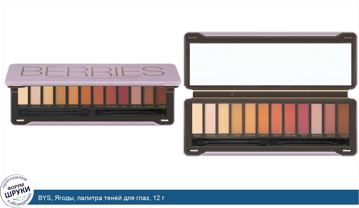 Продукт не тестировался на животных. Цвета включают:. Персиковый. Блеск. Сияние. Ирис. Закат. Волшебный. Королевский. Вишня. Джульетта. Ягодная дымка. Антик. Тень. Палитра теней BYS Berries содержит 12 подобранны...