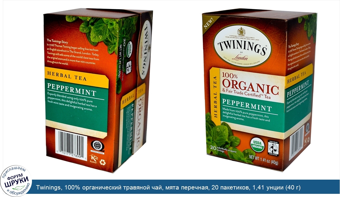 Друзья, если у вас есть отзыв/дополнение/комментарий/вопрос относительно Twinings, 100% органический травяной чай, мята перечная, 20 пакетиков, 1,41 унции (40 г) - напишите его ответом в эту тему (это будет полезно всему сообществу в целом и вам в отдельности).