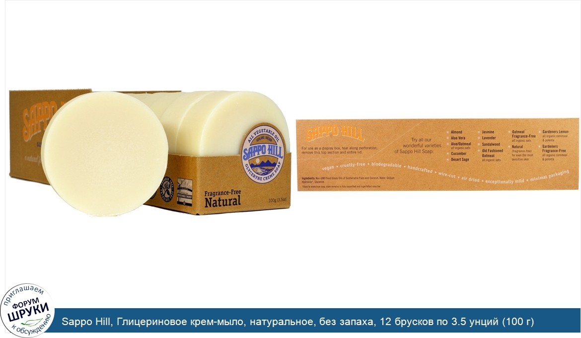 Sappo Hill, Глицериновое крем-мыло, натуральное, без запаха, 12 брусков по 3.5 унций (100 г)
