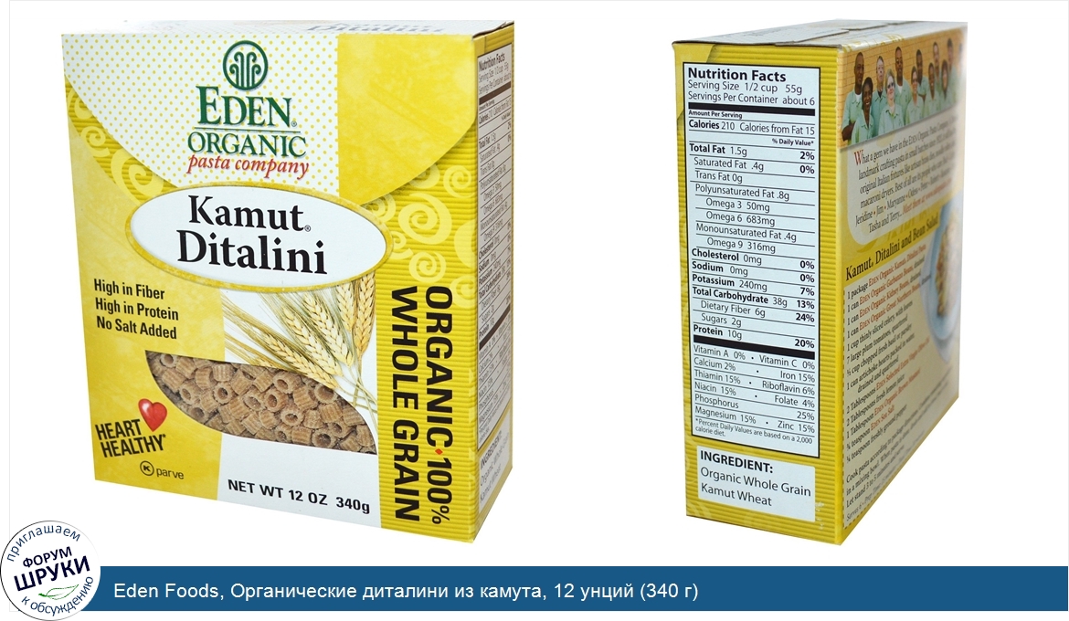 [DESCRIPT]Organically Grown- Double Certified. Authentically Organic. High in Fiber. High in Protein. No Salt Added. Heart Healthy*. Kosher Parve. 100% Whole Grain. OCIA Certified Organic. Kamut Ditalini. Kamut, an ancient grain revived, is a family farm organically grown on the high plains of Montana and freshly milled at Eden. Many with sensitivity to modern wheat can enjoy kamut because of its highly water soluble gluten. Ditalini, meaning small tubes, is great in soup and salads. What a gem we have in the Eden Organic Pasta Company. A Detroit landmark crafting pasta in small batches since 1923, it still has the original Italian fixtures like artisan brass dies, noodle rollers, and macaroni dryers. Best of all are its people who care. Eden selection, meticulous tracking and audited records guarantee the purity of this food from farm to your table.[/DESCRIPT]... (описание дополняется)