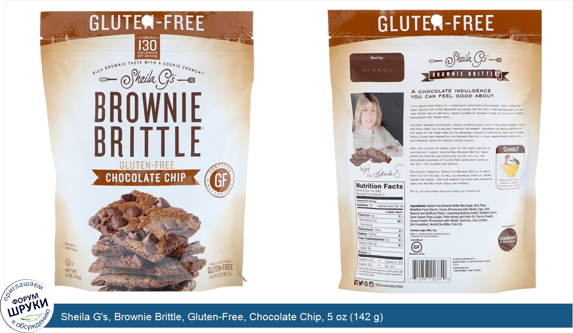 [DESCRIPT]Only 130 Calories per Serving. Rich Brownie Taste with a Cookie Crunch! . Certified Gluten Free. Kosher. Made from Certified Gluten-Free Ingredients. A Chocolate Indulgence You Can Feel Good About. It all began when Sheila G, a passionate chocolate-loving baker, took a treasured family recipe for fudge brownies and baked her way into a thriving business. You may have tasted one of her rich, dense squares of heaven at some of our nation's finest restaurants and theme parks. Like many brownie aficionados, Sheila is particularly fond of the crispy edges. In fact, she took great joy in walking through the bakery, gathering the brittle batter off the sides of the sheet pans as the brownies cooled in their racks. And that is where Sheila found her inspiration for brownie brittle- a thin, award-winning treat with a rich brownie taste, an amazing cookie crunch. Now, she's given the green light to the latest addition in our product lineup: Gluten-free brownie brittle. Same satisfying texture and chocolate flavor, with all the wholesome goodness of gluten-free ingredients baked in, and only 130 calories per serving.[/DESCRIPT]... (описание дополняется)