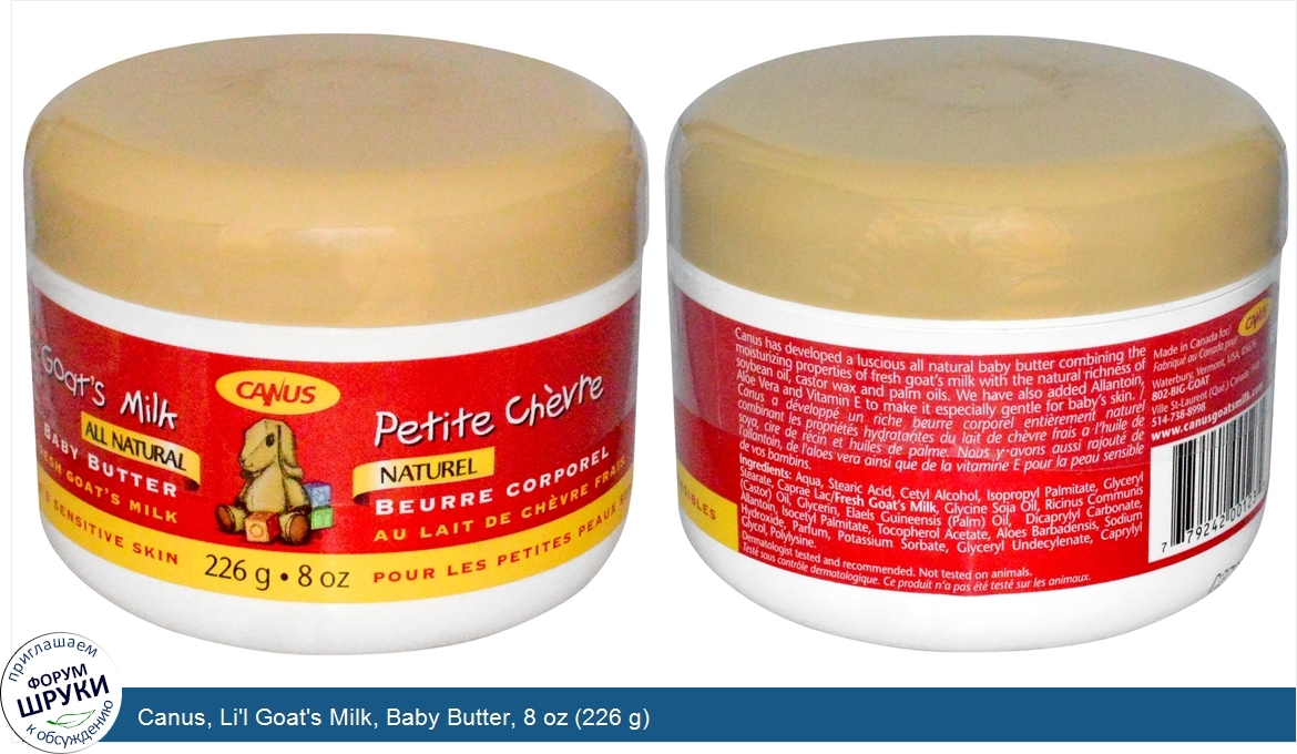 Друзья, если у вас есть отзыв/дополнение/комментарий/вопрос относительно Canus, Li'l Goat's Milk, Baby Butter, 8 oz (226 g) - напишите его ответом в эту тему (это будет полезно всему сообществу в целом и вам в отдельности).