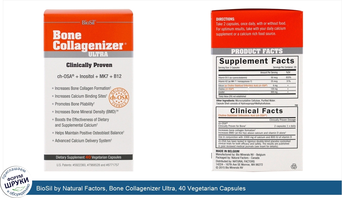 [DESCRIPT]Clinically Proven. ch-OSA® + Inositol + MK7 + B12. Original ch-OSA® Formula. Increases Bone Collagen Formulation. Increases Calcium Binding Sites. Promotes Bone Pliability. Increases Bone Mineral Density (BMD)^. Boosts the Effectiveness of Dietary and Supplemental Calcium. Helps Maintain Positive Osteoblast Balance. Advanced Calcium Delivery System. Dietary Supplement. Suitable for Vegetarians/Vegans. Clinical Trial Results. Results of double-blind, randomized, placebo-controlled clinical trials, with women who added Bone Collagenizer to their daily supplements of 1000 mg of calcium and 800 IU of vitamin D. Collagen Crucial Role in Your Total Bone Health. The National Institutes of Health reports that it takes both calcium and collagen to build strong healthy bones. Collagen makes up 30% of your bone. Collagen serves as the "binding sites" for calcium and gives bone the pliability it needs to withstand physical stress. Age-related diminution of collagen leads to brittle bones and low BMD. The ch-OSA in Collagenizer ULTRA increases bone collagen and BMD. The choline and inositol help maintain "osteo-balance", ensuring proper renewal of bone. The MK7 makes sure calcium gets delivered to the bone site. Vitamin B12 together with choline protects against collagen breakdown. ^Measured at the hip.[/DESCRIPT]... (описание дополняется)
