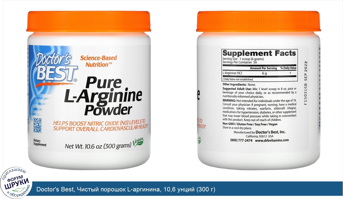 Друзья, если у вас есть отзыв/дополнение/комментарий/вопрос относительно Doctor's Best, Чистый порошок L-аргинина, 10,6 унций (300 г) - напишите его ответом в эту тему (это будет полезно всему сообществу в целом и вам в отдельности).