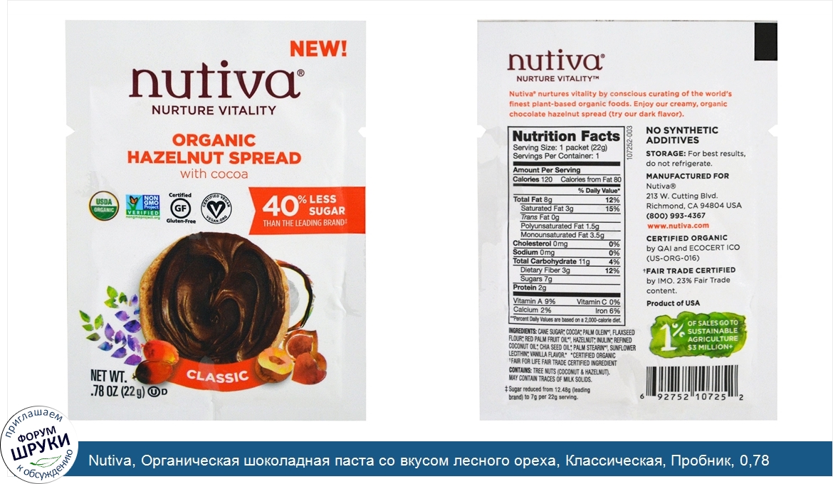 Друзья, если у вас есть отзыв/дополнение/комментарий/вопрос относительно Nutiva, Органическая шоколадная паста со вкусом лесного ореха, Классическая, Пробник, 0,78 жидких унций (22 г) - напишите его ответом в эту тему (это будет полезно всему сообществу в целом и вам в отдельности).