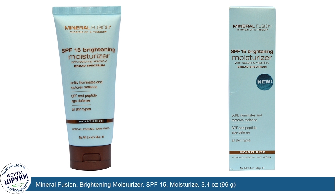 Друзья, если у вас есть отзыв/дополнение/комментарий/вопрос относительно Mineral Fusion, Brightening Moisturizer, SPF 15, Moisturize, 3.4 oz (96 g) - напишите его ответом в эту тему (это будет полезно всему сообществу в целом и вам в отдельности).