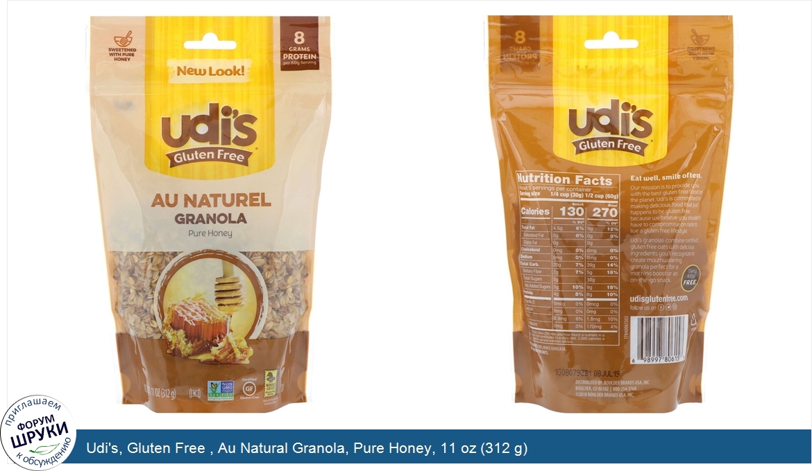 [DESCRIPT]Sweetened With Pure Honey. 8 Grams Protein Per 60 g Serving. Kosher. Non GMO Project Verified. Certified Gluten Free. 100% Whole Grain - 45 g Per 60 g Serving. 100% of the Grain is Whole Grain. Dairy Egg Free. Eat well, smile often. Our mission is to provide you with the best gluten free food on the planet. Udi's is committed to making delicious food that just happens to be gluten free, because we believe you shouldn't have to compromise on taste to live a gluten free lifestyle. Udi's granolas combine certified gluten free oats with delicious ingredients you'll recognize to create mouthwatering granola perfect for a morning boost or an on-the-go snack.[/DESCRIPT]... (описание дополняется)
