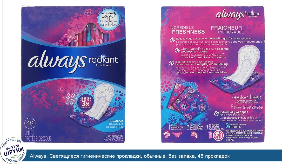 [DESCRIPT]Individually Wrapped for Ultimate Portability! . Absorbs 3X More. Incredible Protection, Wear What You Want. 100% Leak-Free. Periods Are Possible. Fabulous Florals Wrapper Collection. Freedom to Wear What You Want. Always Radiant Liners keep you feeling fresh every day! They absorb 3X more.* And they feature a CleanGuard Quilted Core that absorbs wetness and odors to help you stay feeling confident. Plus, their Edge2Edge Adhesive helps the liner in place for stayput protection. For a clean feeling every day of the month, try Always Radiant Liners. Incredible Freshness:. Edge to edge adhesive to move with you for amazing comfort. CleanGuard quilted core absorbs wetness and odors. Ideal for light flow days, tampon back-up and an everyday clean feeling. Radiant Liners: This super thin and flexible liner is the perfect accessory for even the most daring dress. Why You'll Love It:. 3X more absorbent (vs. Always Sheer Dailies) with a panty-like feel you'll love. Individually wrapped for on-the-go protection that won't slow you down. CleanGuard quilted core absorbs wetness and odors. Edge to edge adhesive moves with you for amazing comfort. Unscented for protection that goes unnoticed. *Vs. Always Sheer Dailies.[/DESCRIPT]... (описание дополняется)