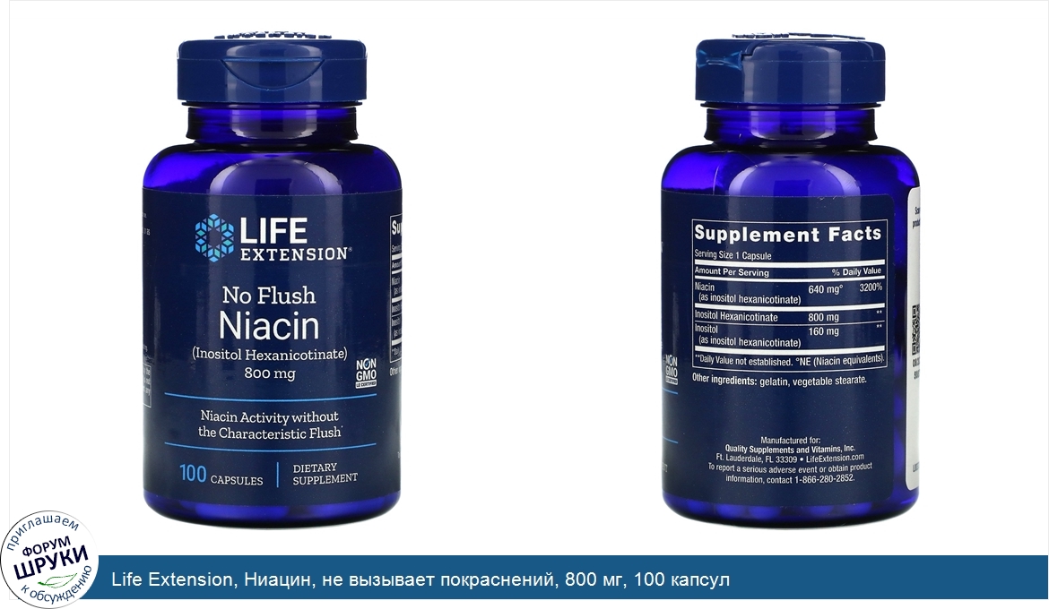 Life Extension, Ниацин, не вызывает покраснений, 800 мг, 100 капсул