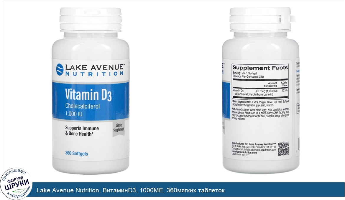 Друзья, если у вас есть отзыв/дополнение/комментарий/вопрос относительно Lake Avenue Nutrition, ВитаминD3, 1000МЕ, 360мягких таблеток - напишите его ответом в эту тему (это будет полезно всему сообществу в целом и вам в отдельности).