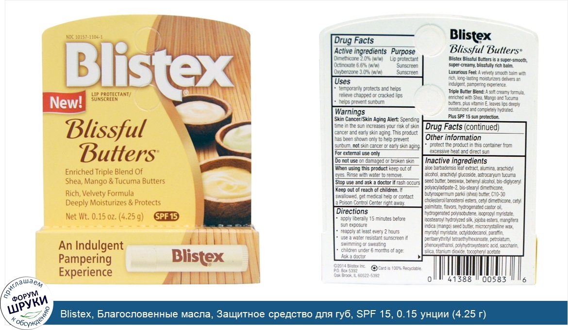 [DESCRIPT]New! . Enriched Triple Blend of Shea, Mango Tucuma Butters. Rich, Velvety Formula. Deeply Moisturizes Protects. An Indulgent Pampering Experience. Uses. Temporarily protects and helps relieve chapped or cracked lips. Helps prevent sunburn. Blistex Butters is a super-smooth, super-creamy, blissfully rich balm. Luxurious Feel: A velvety smooth balm with rich, long-lasting moisturizers delivers an indulgent, pampering experience. Triple Butter Blend: A soft creamy formula, enriched with Shea, Mango and Tucuma butters, plus vitamin E, leaves lips deeply moisturized and completely hydrated. Plus SPF 15 sun protection.[/DESCRIPT]... (описание дополняется)