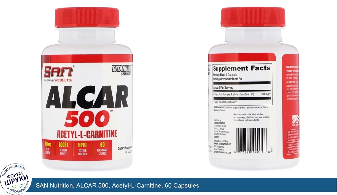 SAN Nutrition, ALCAR 500, Acetyl-L-Carnitine, 60 Capsules
