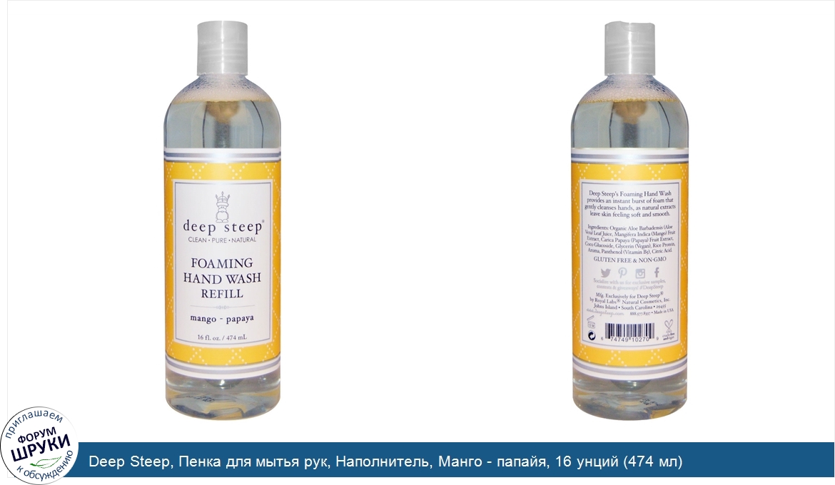 Друзья, если у вас есть отзыв/дополнение/комментарий/вопрос относительно Deep Steep, Пенка для мытья рук, Наполнитель, Манго - папайя, 16 унций (474 мл) - напишите его ответом в эту тему (это будет полезно всему сообществу в целом и вам в отдельности).