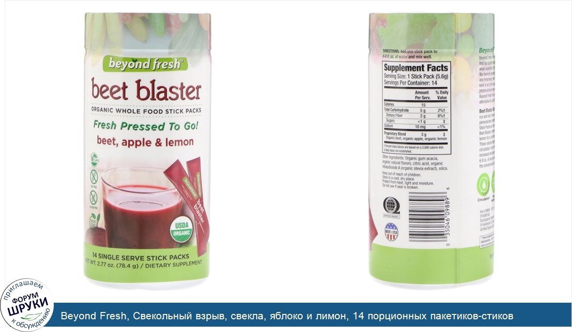 [DESCRIPT]Organic Whole Food Stick Packs. Fresh Pressed To Go! . Vegan. Soy Free. Gluten Free. Non GMO. USDA Organic. Dietary Supplement. Circulation. Exercise Performance. Endurance. Heart Health. Certified Organic by QAI. Beyond Fresh story. Beyond Fresh is more than a name - it's a promise that our quality natural supplements are in many way superior to the freshest fruits and vegetables. We harvest ripened product at the peak of its flavor and freshness, then use advanced technologies to lock in all of the valuable vitamins, minerals, phytonutrients and enzymes. This makes Beyond Fresh the convenient and nutritious alternative to juicing! Beet Blaster Stick Packs. When you're on the run and don't have time to create a Beyond Fresh personalized smoothie, our Fresh Pressed to Go Stick Packs are the perfect, convenient option. Beet Blast combines USDA Organic beet, apple and lemon for a nutritious, great tasting, healthy drink. These natural ingredients help promote proper circulation, heart health, improved performance and increase endurance. Just empty a stick pack into 6-8 oz. of water and enjoy the power of beets with the convenience of a portable drink mix![/DESCRIPT]... (описание дополняется)