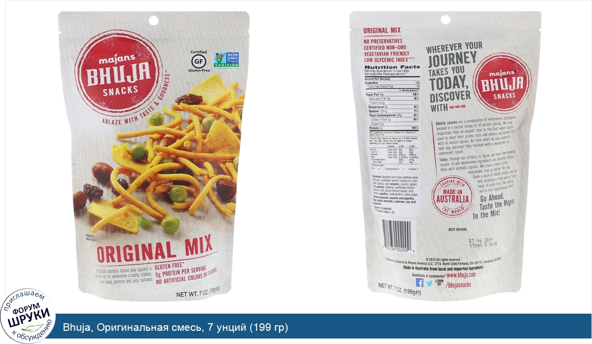 [DESCRIPT]Majans Bhuja Snacks. Ablaze with Taste Goodness. Certified Gluten-Free*. Non GMO Project Verified. 5 g Protein Per Serving. No Artificial Colors or Flavors. No Preservatives. Vegetarian Friendly. Low Glycemic Index***. Sharing with the World - Made in Australia. Delightfully aromatic spices play against a marvelous mix of wholesome crunchy nibbles, garden peas, peanuts and juicy sultanas. Wherever your journey takes you today, discover with Majans Bhuja Snacks. Bhuja snacks are a combination of wholesome ingredients blended in a secret recipe of all natural spices. We draw inspiration from an ancient time in the East when families used to roast their grains, nuts and pulses and blended them with all natural spices. As time went on and adventurers took long journeys, they traveled with a wholesome, yet convenient snack. Today, through our artistry in flavor, we follow time-honored recipes to add wholesome ingredients and delicately infuse them with aromatic spices. We create crunchy taste sensations that are better for you. Open a pack of Bhuja snacks and you hold adventure in the palm of your hand. A taste treat like nothing you've ever experienced before. Go Ahead, Taste the Magic in the Mix! *Gluten not detected. ***Glycemic index < 55.[/DESCRIPT]... (описание дополняется)