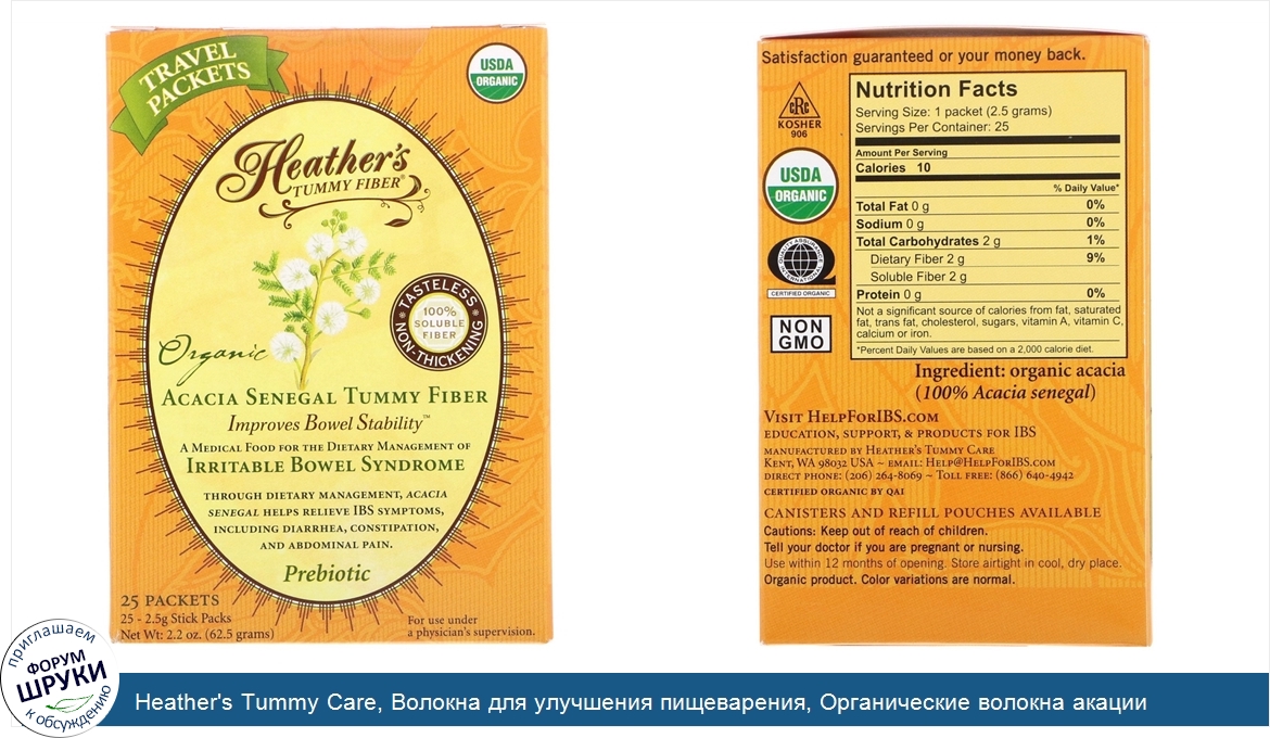 [DESCRIPT]USDA Organic. Tasteless. Non-Thickening. 100% Soluble Fiber. A Medical Food for the Dietary Management of Irritable Bowel Syndrome. Prebiotic Soluble Fiber ~ Encourages Healthy Gut Flora. Kosher. Certified Organic by QAI. Non GMO. Through dietary management, Acacia senegal helps relieve IBS symptoms, including diarrhea, constipation, and abdominal pain. A medical food for the dietary management of Irritable Bowel Syndrome symptoms. Acacia senegal is a natural (not synthetic) whole food soluble fiber with a clinically proven prebiotic effect. Studies show that soluble fiber, as part of the diet, helps regulate bowel motility (alleviating both diarrhea and constipation), and relieves abdominal pain from IBS. Acacia senegal's prebiotic effect stimulates the growth of healthy gut flora for ideal bowel stability, which can reduce bloating, gas, and bowel irregularities from IBS. Heather's Tummy Fiber is unique, because it has a good gastrointestinal tolerance and a proven significantly bifidogenic effect. Heather's Tummy Fiber is formulated specifically for the dietary management of IBS and improved bowel stability. Heather's Tummy Fiber is 100% Acacia senegal, never low grade Acacia seyal. Heather's Tummy Fiber has no psyllium, FOS, inulin, Fodmaps, or IBS triggers:. No insoluble fiber. No citric acid. No gluten. No artificial colors or flavors. No artificial sweeteners. No GI stimulants or irritants.[/DESCRIPT]... (описание дополняется)