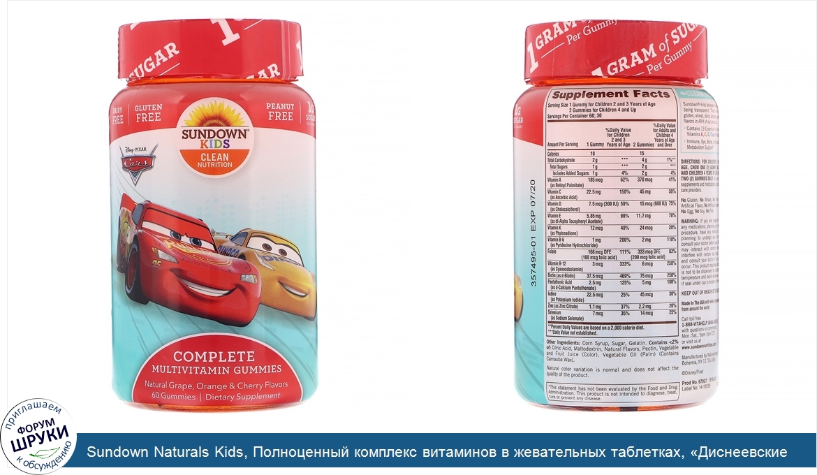 Друзья, если у вас есть отзыв/дополнение/комментарий/вопрос относительно Sundown Naturals Kids, Полноценный комплекс витаминов в жевательных таблетках, «Диснеевские тачки», натуральные виноград, апельсин и вишня, 60жевательных таблеток - напишите его ответом в эту тему (это будет полезно всему сообществу в целом и вам в отдельности).