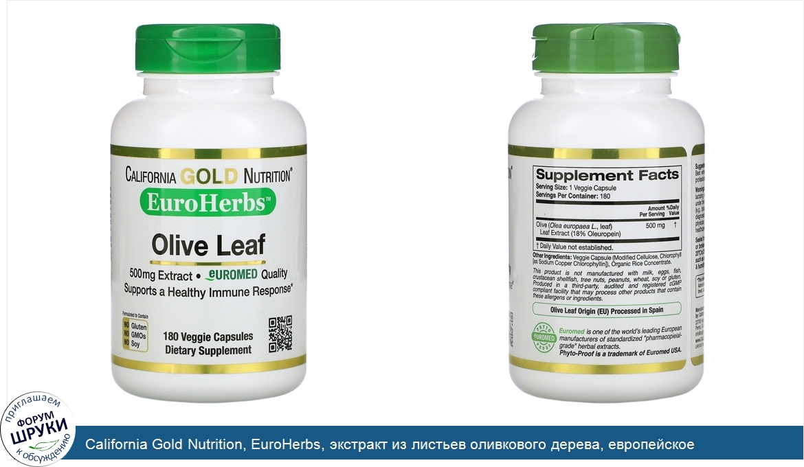 . Экстракт листьев оливкового дерева. California Gold Nutrition EuroHerbs. ™. 500 мг экстракта, стандартизированного до 18% олеуропеина. Европейское сырье, фармакопейный класс. Качество EuroMed, технология Phyto ...
