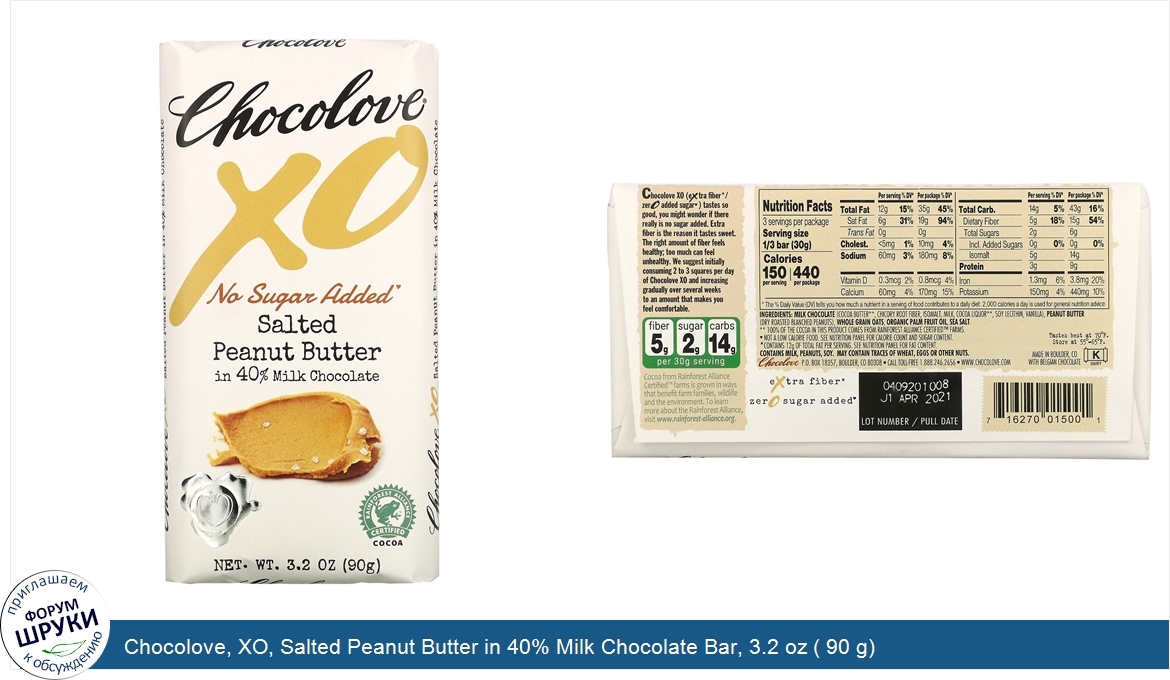 Друзья, если у вас есть отзыв/дополнение/комментарий/вопрос относительно Chocolove, XO, Salted Peanut Butter in 40% Milk Chocolate Bar, 3.2 oz ( 90 g) - напишите его ответом в эту тему (это будет полезно всему сообществу в целом и вам в отдельности).