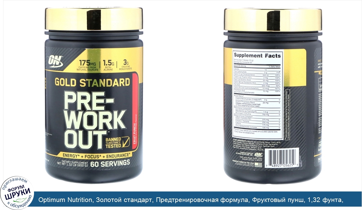 Optimum Nutrition, Золотой стандарт, Предтренировочная формула, Фруктовый пунш, 1,32 фунта, (600 г)
