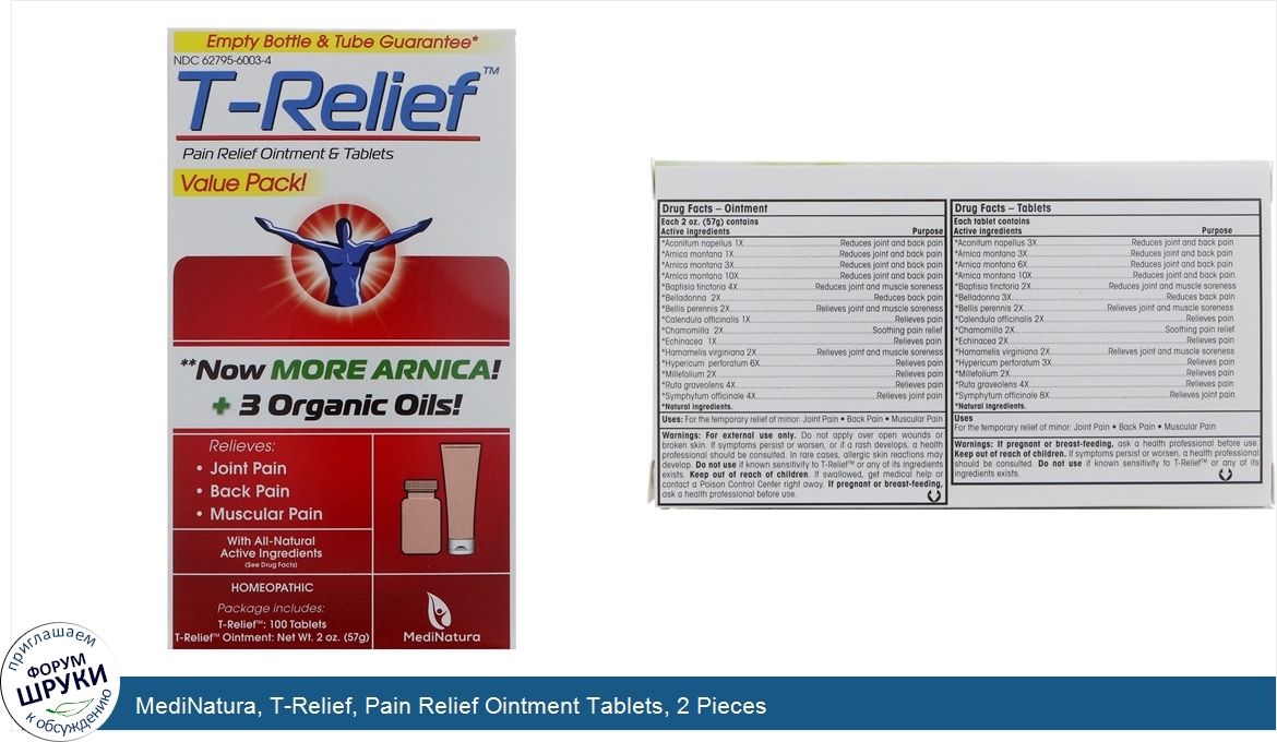 Value Pack! . **NOW More Arnica! +3 Organic Oils. With All-Natural Active Ingredients. Homeopathic. Relieves:. Joint Pain. Back Pain. Muscular Pain. Package includes:. T-Relief: 100 Tablets. T-Relief Ointment: Ne...