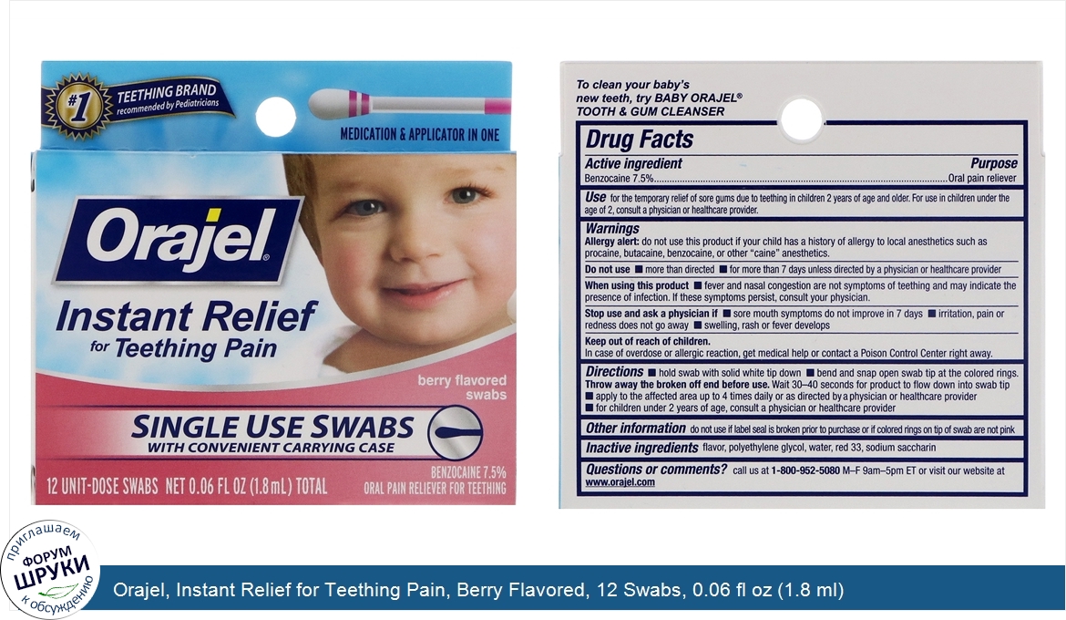 Orajel, Instant Relief for Teething Pain, Berry Flavored, 12 Swabs, 0.06 fl oz (1.8 ml)