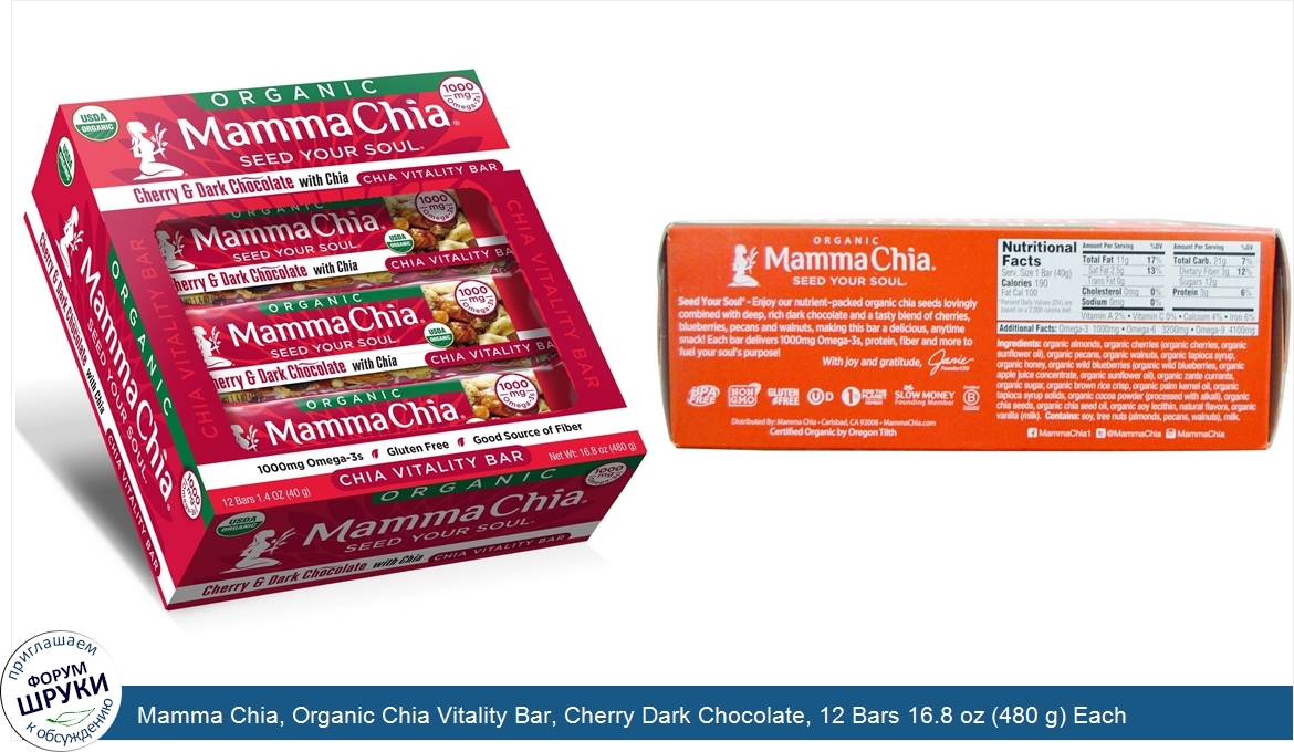 Друзья, если у вас есть отзыв/дополнение/комментарий/вопрос относительно Mamma Chia, Organic Chia Vitality Bar, Cherry Dark Chocolate, 12 Bars 16.8 oz (480 g) Each - напишите его ответом в эту тему (это будет полезно всему сообществу в целом и вам в отдельности).