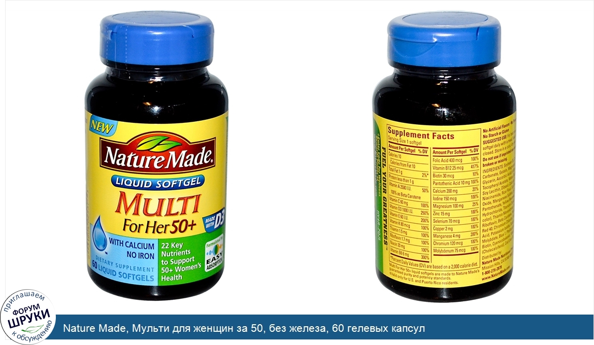 Друзья, если у вас есть отзыв/дополнение/комментарий/вопрос относительно Nature Made, Мульти для женщин за 50, без железа, 60 гелевых капсул - напишите его ответом в эту тему (это будет полезно всему сообществу в целом и вам в отдельности).